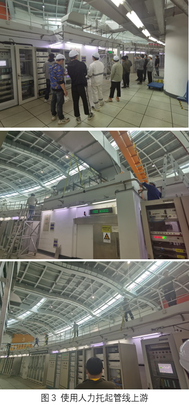 经现场研究讨论,大家快速制定形成了周密的维修处置方案,分工明确,步骤清晰。说干就干,维修的第一步是将管线上下游3处L段法兰脱开,这其中包括存在泄漏问题的2个,再解开约束管线的一系列卡箍,这样使得管线的内管抽出时,整个管线具备活动的空间。第二步是将脱开的管线妥善固定,由于管线长度20米以上,第一时间使用大厅的航吊将管线下游吊起悬空,然后用4根吊带将上游管线在4处抬起,借助隧道顶端护栏以及人力,顺利将管线的内管抽出。第三步,更换密封材料。第四步,重新插入内管,锁紧法兰,完成管线的连接,复位所有卡箍。