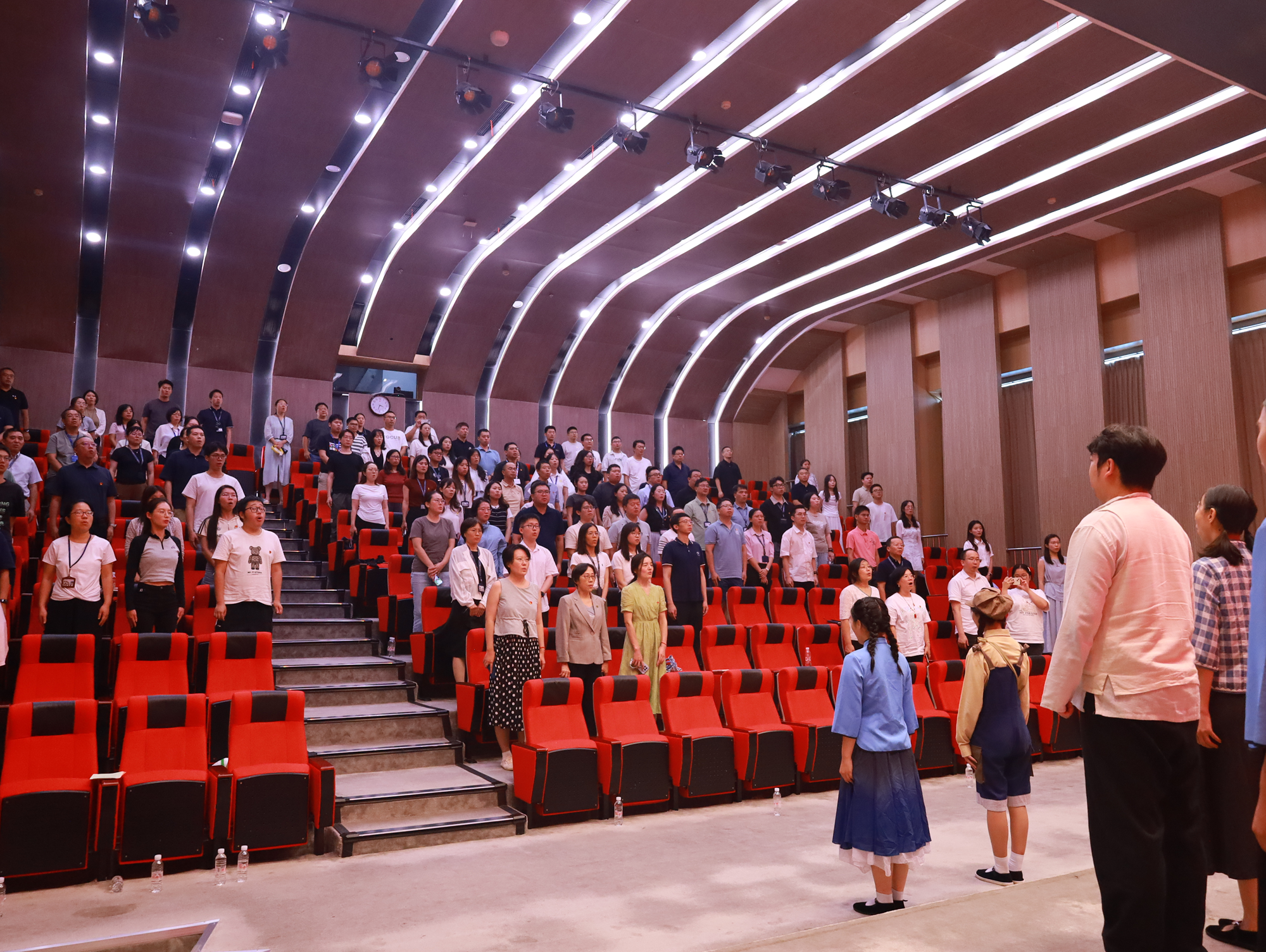 专业演员现场演绎《国之当歌》的经典选段,以音乐深情再现聂耳、田汉“以文艺为武器”的斗争历程。7位PA真人视讯的青年学生自发登台与专业演员互动,共同演绎经典曲目《卖报歌》和《毕业歌》。当《义勇军进行曲》旋律响起,全场党员同志怀着激动的心情肃立高唱,激昂的旋律与雷鸣掌声交织,将“天下兴亡,匹夫有责”的精神传承具象化。