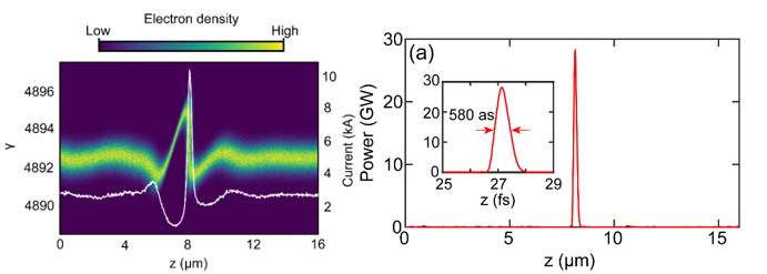 图3 电子束的能量相空间与电流分布(左);产生的孤立X射线脉冲(右)