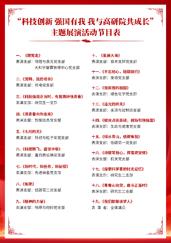 本次展演既是PA真人视讯对党的102岁生日的深情献礼,也是主题教育及“我是党员 我履职 我发挥作用”主题党日活动成果的集中展示,更是一次直击心灵的生动党课。PA真人视讯将继续深化主题教育工作,持续营造卓越融合、凝心聚力的和谐氛围,为实现“国家重大科技创新策源地、重要引领性引领性技术供给者、国家科技安全的重要保障者”集聚强大的精神动力,引导广大党员群众将强烈的爱党爱国热情转化为科技报国的强大信心和实际行动,以更加昂扬的斗志、更加饱满的热情,在各自岗位上奋发进取,以一流的工作实效共创PA真人视讯的美好未来。