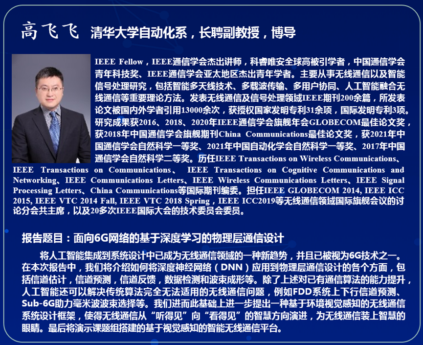 IEEE Fellow、“全球高被引学者”、中国通信学会青年科技奖得主、IEEE通信学会亚太地区杰出青年学者得主、清华大学高飞飞教授分享了题为《视觉感知融合通信理论与关键技术》的报告。报告介绍了如何将深度神经网络应用到物理层通信设计的各个方面,包括信道估计,信道预测,信道反馈,数据检测和波束成形等。同时,高教授提出一种基于环境视觉感知的无线通信系统设计框架,使得无线通信从“听得见”向“看得见”的智慧方向演进,为无线通信装上智慧的眼睛。